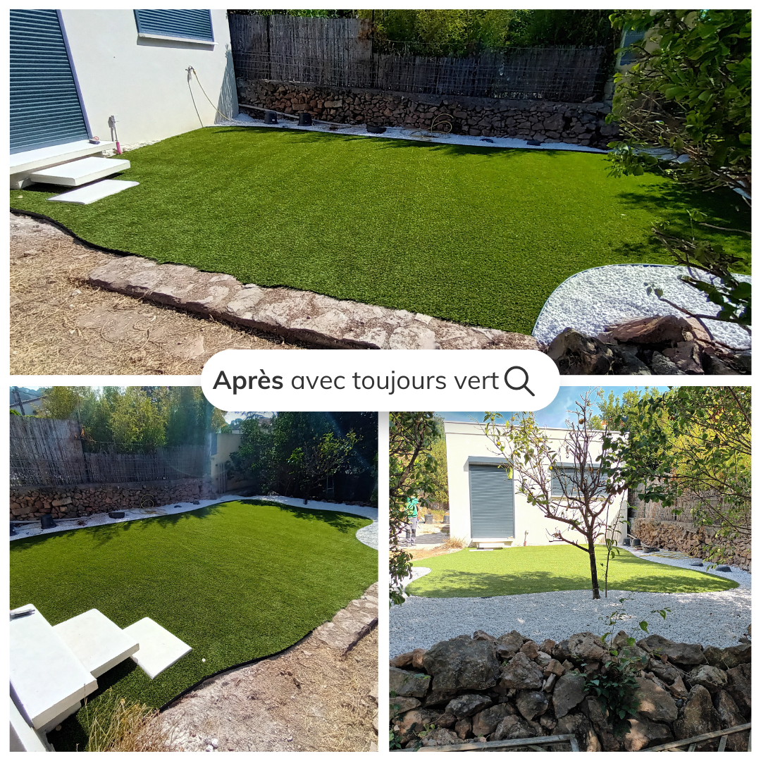Chez Toujours Vert 34, nous sommes fiers de vous présenter notre récente réalisation à Castelnau-le-Lez. Nous avons transformé un jardin délaissé en un magnifique espace vert. Cette transformation avant et après démontre l’impact visuel et fonctionnel de notre gazon synthétique de haute qualité.